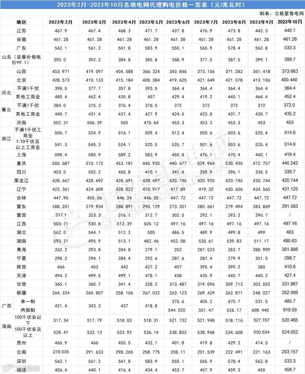 导读:近日,全国各地2023年10月电网企业代理购电价格陆续公布。北极星售电网汇总了2023年2月-2023年10