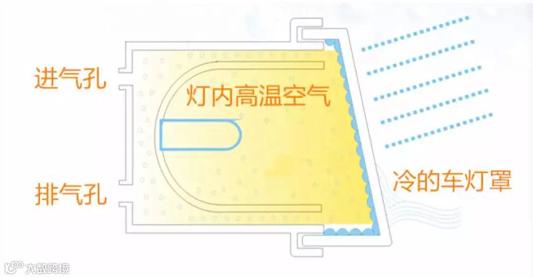大灯并不是完全密封的,它设有进气孔和排气孔。当车灯内的热空气遇到冷的车灯罩时,就会液化成小水珠附着在车灯罩的内壁上,形成我们看见的雾气。