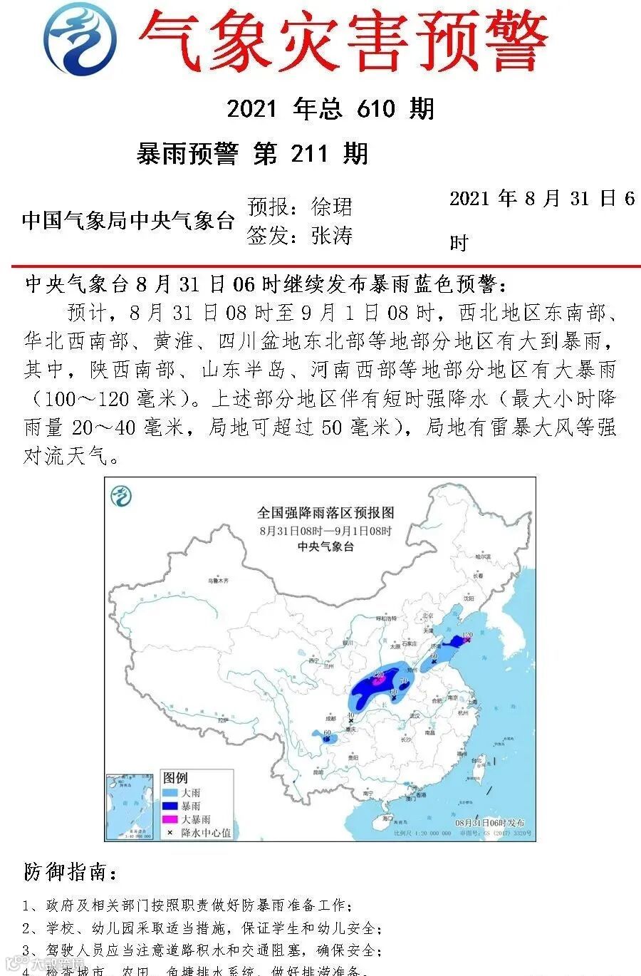 中央气象台8月31日06时发布暴雨蓝色预警: