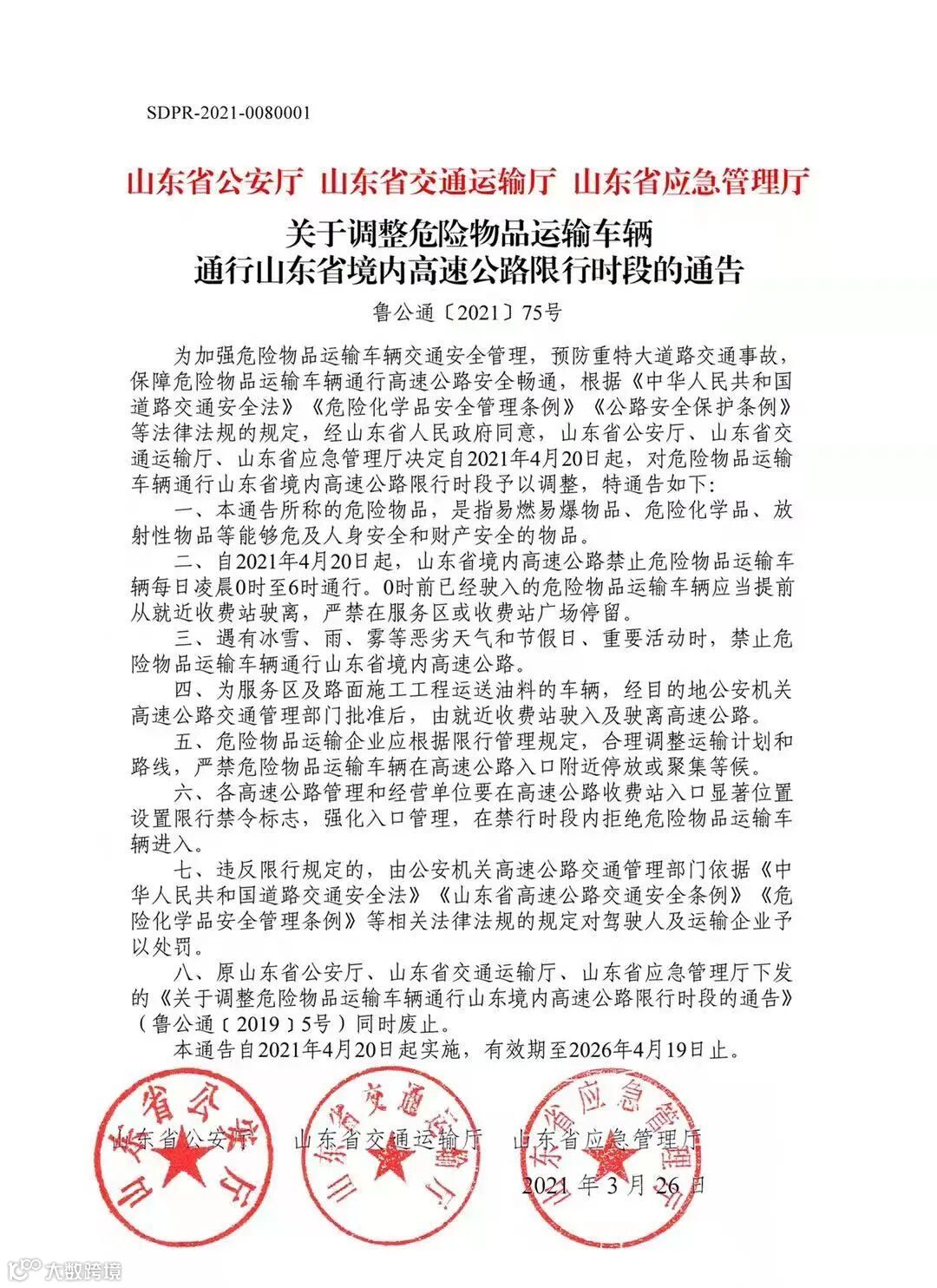 近日,山东省公安厅、山东省交通运输厅、山东省应急管理厅联合下发文件,决定自2021年4月20日起,将危险物品运输车辆通行山东省境内高速公路限行时段由22时至次日凌晨6时,调整为每日凌晨0时至6时。在此时间段,山东省境内所有高速公路禁止危化品运输车辆通行。0时前已经驶入的危险物品运输车辆应当提前从就近收费站驶离,严禁在服务区或收费站广场停留。