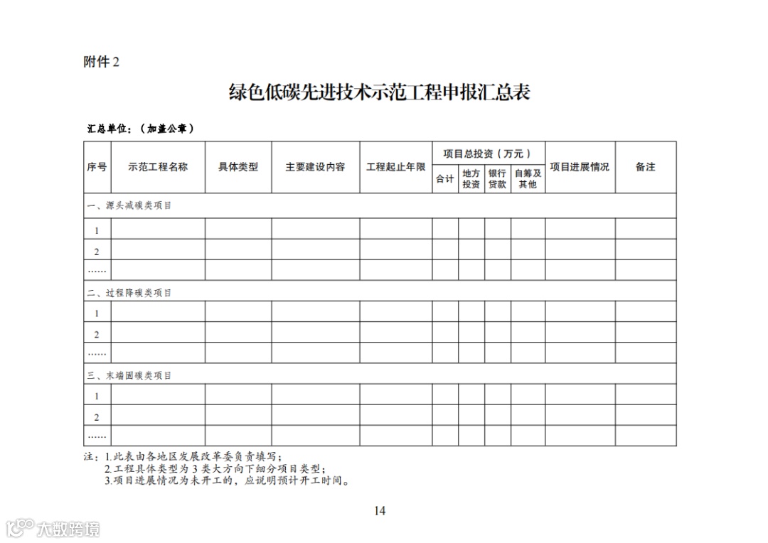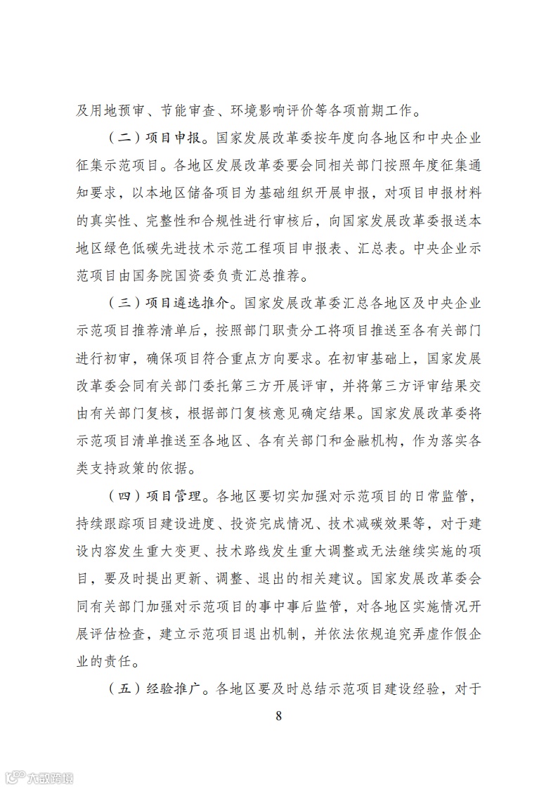 2023年首批示范项目申报工作同步启动,按照优中选优、宁缺毋滥的原则,各地区报送数量不超过10个。各地区发展改革委要会同本地区有关部门做好示范项目组织和申报工作,中央企业示范项目由国务院国资委负责汇总推荐,项目申报表、汇总表请于2023年10月8日前报送至国家发展改革委(环资司)。