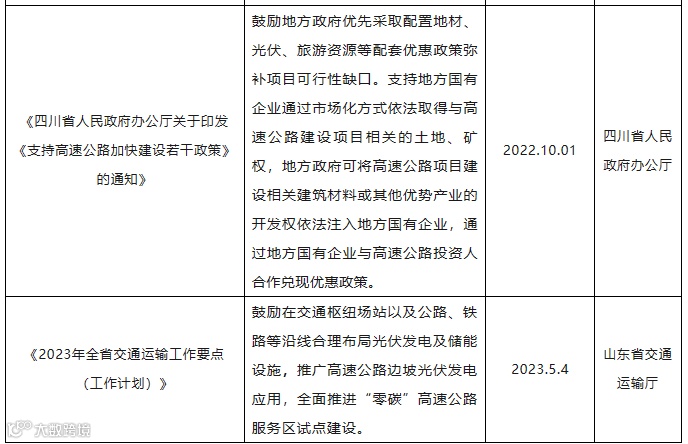 面对国家层面的支持与鼓励,各地方政府也纷纷响应纷纷发文支持“光伏+交通”发展,部分政策汇总见下表: