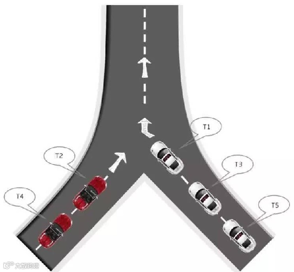 两侧车道车辆同时驶入汇流点的,应当让右车先行,按照右车、左车、右车……的次序依次交替通行。