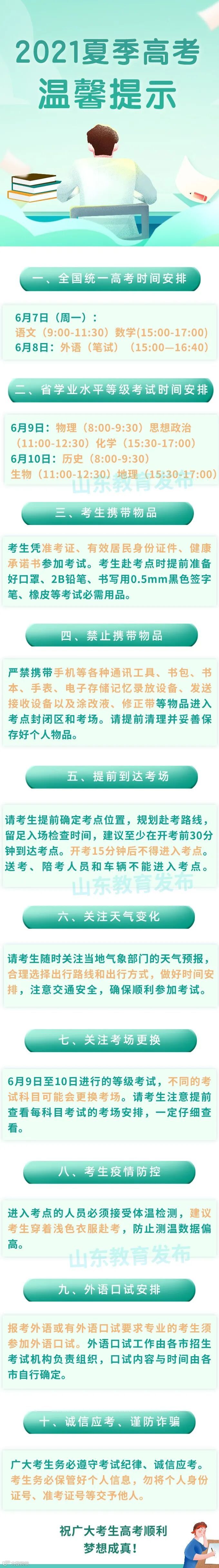 鲁中、鲁南等地几乎没有降雨,还有35℃以上的高温出现,局部可达39℃,考生要注意携带防晒避暑物品。