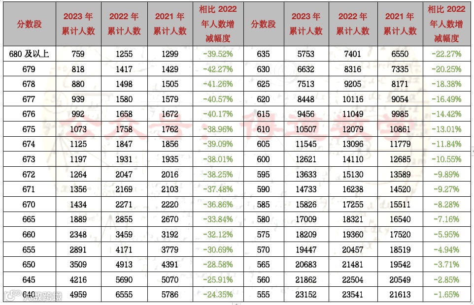 尤其相比较前几年,今年天津本科院校录取率下降了大约8%。按照前30%排名比例划定的分数线(563分)为一本线参考,与去年(2022年)相比,本科录取控制分数线提高了9分,而一本线(前30%)降低了差不多20分。可见天津本次高考的难度有所提升。