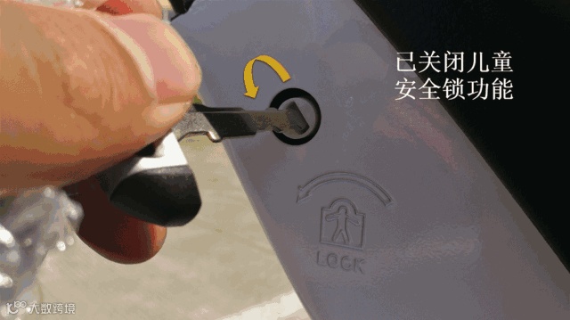 取消儿童锁:翻出机械钥匙,插入儿童锁锁孔,将儿童锁旋至解锁位置,即可取消儿童锁功能。