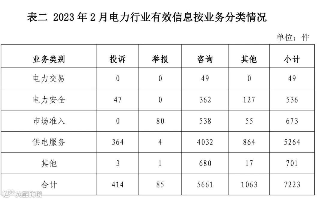 3月16日,国家能源局通报了“12398能源监管热线”的投诉、举报、咨询情况。2023年2月,共收到有效信息10264件,其中: