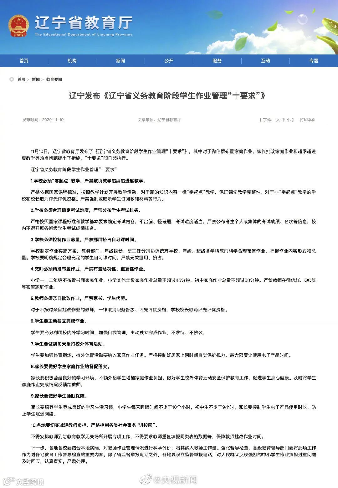 针对这一热点问题,11月10日,辽宁省教育厅发布《辽宁省义务教育阶段学生作业管理“十要求”》。政策明确,规定教师严禁布置惩罚性、重复性作业;小学除一、二年级之外家庭作业总量不超过45分钟,初中家庭作业总量不超过60分钟;严禁教师在微信群QQ群布置家庭作业;教师必须亲自批改作业,严禁家长、学生代劳等。