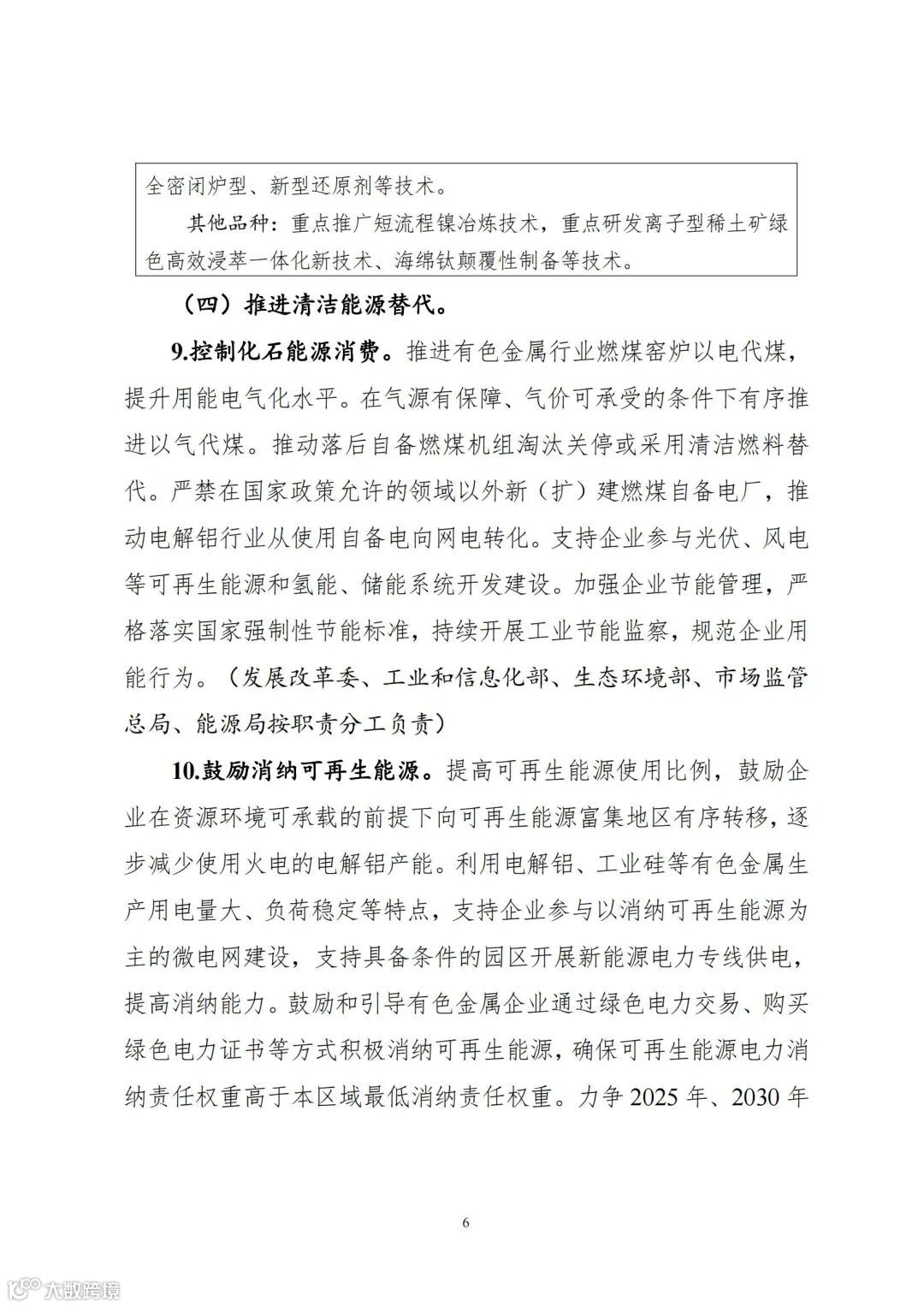 工信部网站发布《三部门关于印发有色金属行业碳达峰实施方案的通知》,通知指出,鼓励消纳可再生能源。提高可再生能源使用比例,鼓励企业在资源环境可承载的前提下向可再生能源富集地区有序转移,逐步减少使用火电的电解铝产能。利用电解铝、工业硅等有色金属生产用电量大、负荷稳定等特点,支持企业参与以消纳可再生能源为主的微电网建设,支持具备条件的园区开展新能源电力专线供电,提高消纳能力。鼓励和引导有色金属企业通过绿色电力交易、购买绿色电力证书等方式积极消纳可再生能源,确保可再生能源电力消纳责任权重高于本区域最低消纳责任权重。力争2025年、2030年电解铝使用可再生能源比例分别达到25%、30%以上。(发展改革委、工业和信息化部、能源局按职责分工负责)