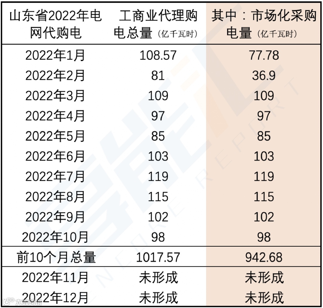 2022年为电网代购电入市第一年,1-10月市场化采购电量为942.68亿千瓦时,预计到年底将超过1100亿。山东省从今年3月开始,代购电就没有了优先发电量,100%为市场化采购电。(见下图1)