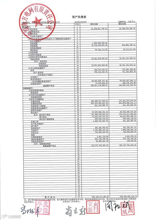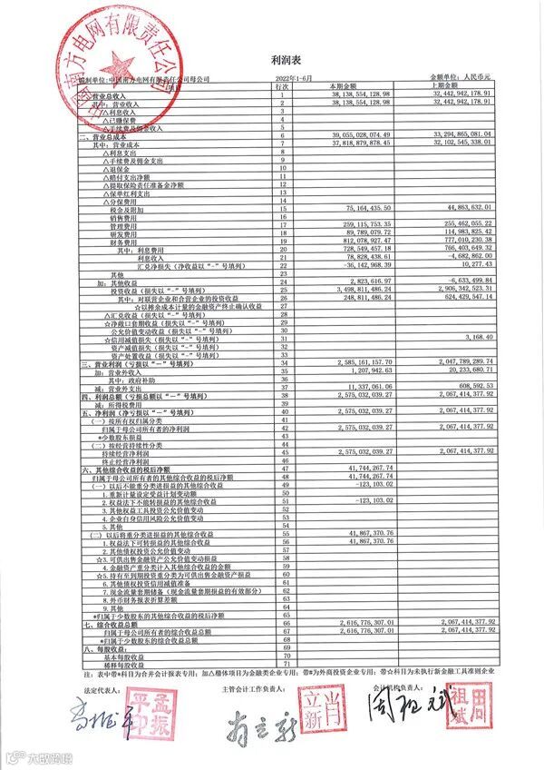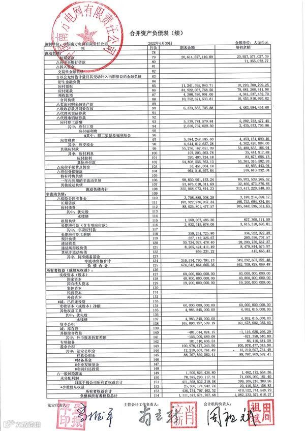 附:中国南方电网有限责任公司2022年半年度财务报告