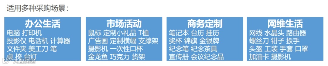 采购部门为用户提供跨品类的场景式采购解决方案,通过采购商城呈现给企业需求部门。用户通过场景化采购,享受到一站式采购服务。