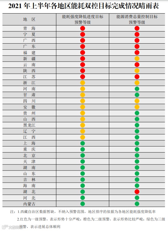 日前国家发改委发布《2021年上半年各地区能耗双控目标完成情况晴雨表》,称能耗强度降低方面,青海、宁夏、广西、广东、福建、新疆、云南、陕西、江苏9个省(区)上半年能耗强度不降反升,为一级预警;浙江、河南、甘肃、四川、安徽、贵州、山西、黑龙江、辽宁、江西10个省上半年能耗强度降低率未达到进度要求,为二级预警;上海、重庆、北京、天津、湖南、山东、吉林、海南、湖北、河北、内蒙古11个省(区、市)为三级预警。