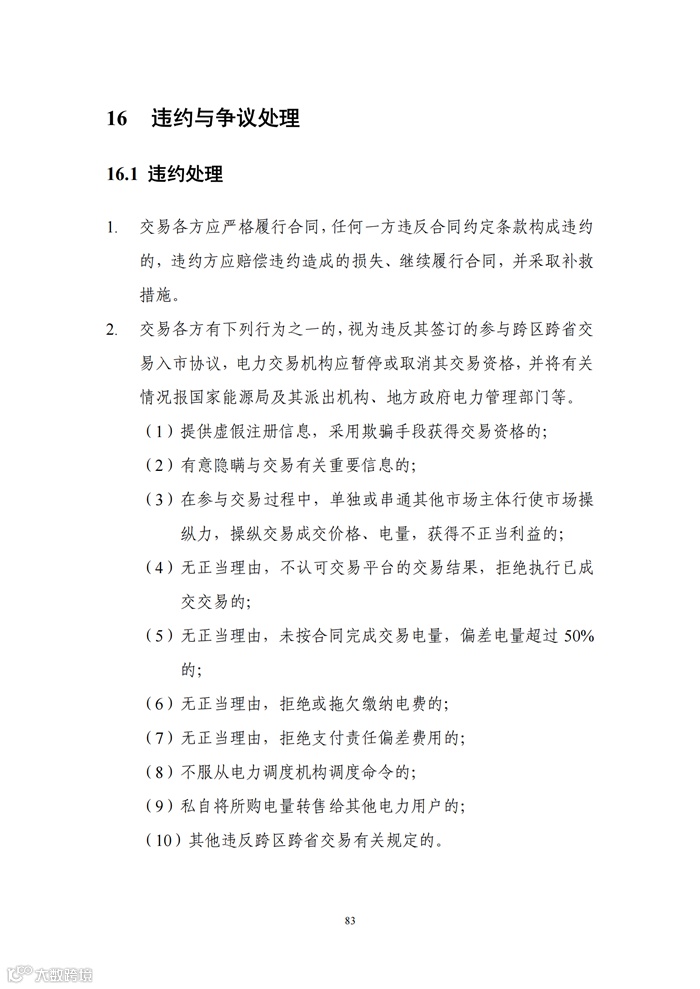 交易各方有下列行为之一的,视为违反其签订的参与跨区跨省交易入市协议,电力交易机构应暂停或取消其交易资格,并将有关情况报国家能源局及其派出机构、地方政府电力管理部门等。(1)提供虚假注册信息,采用欺骗手段获得交易资格的;(2)有意隐瞒与交易有关重要信息的;(3)在参与交易过程中,单独或串通其他市场主体行使市场操纵力,操纵交易成交价格、电量,获得不正当利益的;(4)无正当理由,不认可交易平台的交易结果,拒绝执行已成交交易的;(5)无正当理由,未按合同完成交易电量,偏差电量超过 50% 的;(6)无正当理由,拒绝或拖欠缴纳电费的;(7)无正当理由,拒绝支付责任偏差费用的;(8)不服从电力调度机构调度命令的;(9)私自将所购电量转售给其他电力用户的;(10)其他违反跨区跨省交易有关规定的。