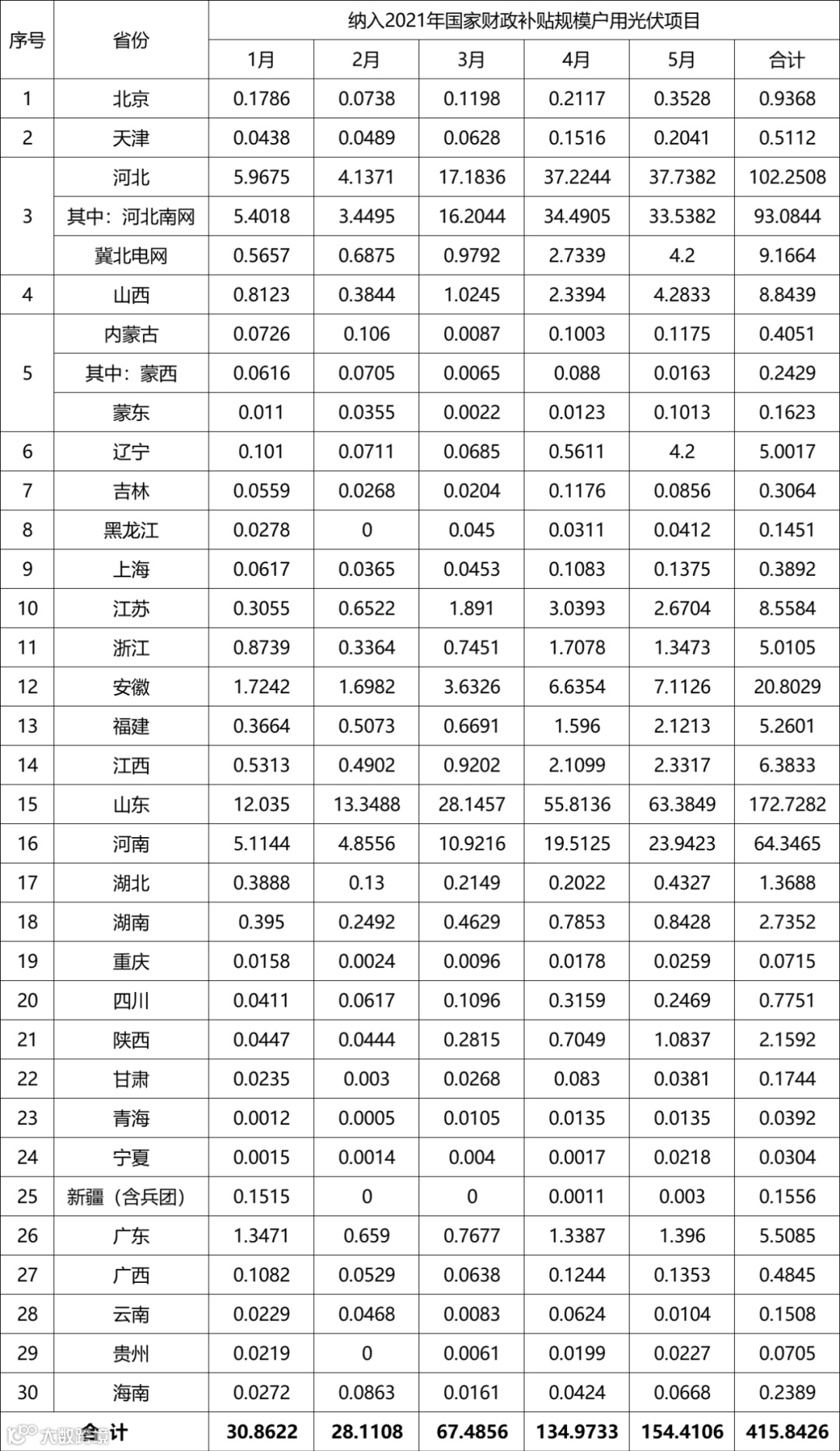 根据各省级能源主管部门、电网企业报送信息,经国家可再生能源信息管理中心梳理统计,截至2021年5月底,全国累计纳入2021年国家财政补贴规模户用光伏项目装机容量为415.84万千瓦。