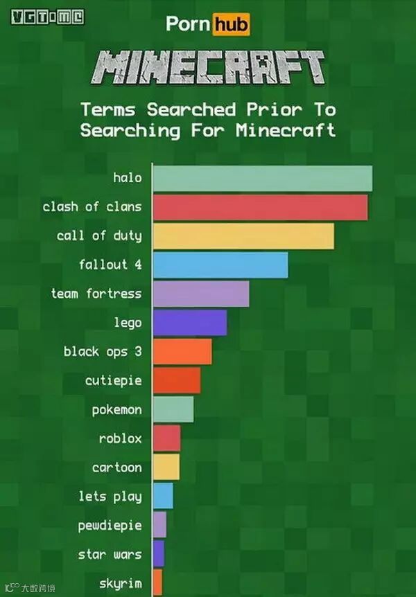 网站数据表示,搜索“Minecraft”的用户中91%不满25岁,其中18-24岁的用户占80%,男性占比85%,女性想要观看“Minecraft”成人片的则只有15%。除了《我的世界》之外,在成人网站上受到热捧的游戏还有:《光晕》、《部落冲突》、《使命召唤》、《辐射4》等,老实说这些大作被搜索一点都不奇怪,但是《神奇宝贝》、《乐高》和著名Youtube游戏播主PewDiePie也出现了榜单中到底是怎么一回事?喂喂,这未免也太丧心病狂了吧?