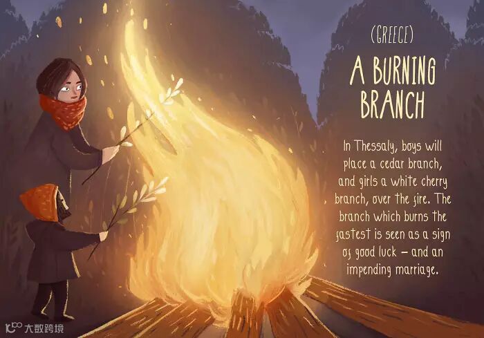 男生要拿雪松树枝,女生则是拿白樱桃树的树枝放在火上烤,谁的树枝烧得最快,谁就是来年的人生赢家。