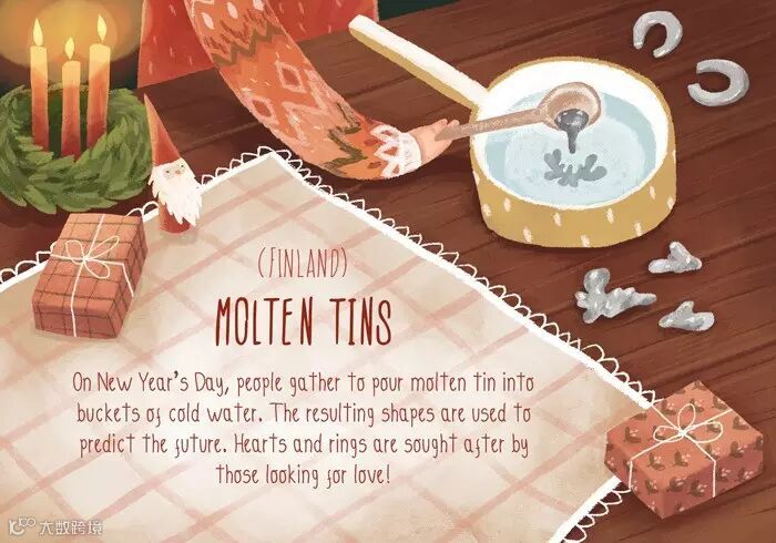 把锡融化之后倒入冷水中会凝结成不同的形状,芬兰人认为这些形状会预示未来,比如心形或者象征戒指的环形就代表会收获爱情。