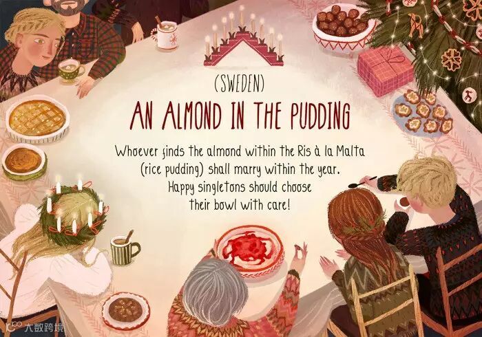 圣诞晚宴的最后,会上一道甜点 Ris à la Manda(米布丁),其中一碗会放进一颗杏仁,谁吃到了杏仁未来的一年就会结婚。