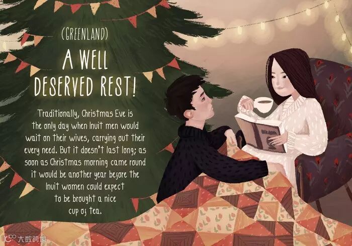 在平安夜当天,格陵兰的丈夫们都会对妻子千依百顺,无论是什么要求都会尽量满足,让辛苦了一年的妻子可以好好休息,但是平安夜过去之后老公们就会恢复原状,所以对妻子来说这是值得珍惜的一天。