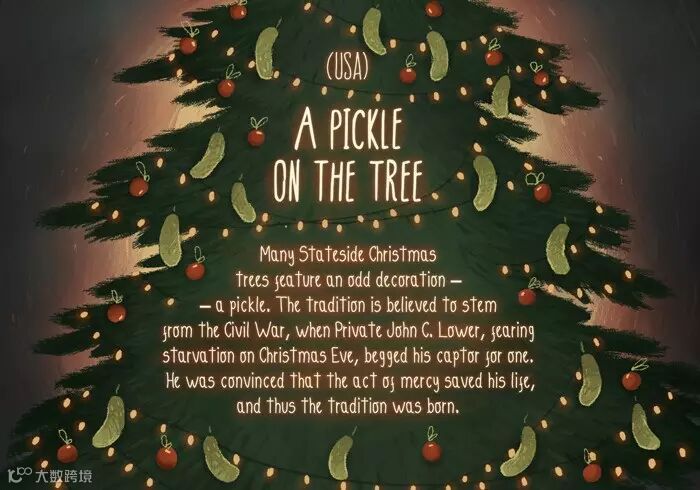 传说在内战时,一个名叫John C. Lower 被俘虏的士兵圣诞前夕担心被饿死,就恳求了敌人给他东西吃,于是敌人就在圣诞树上挂上了酸黄瓜,救了他一命。所以现在很多美国家庭会在圣诞树上悬挂酸黄瓜 ,纪念这一行为。