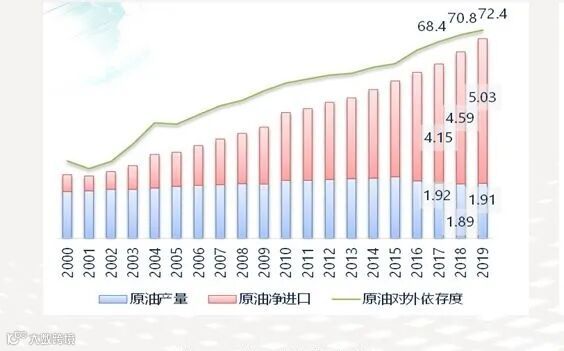 “油气供给受制于人”成为了悬在中国能源界头上的“达摩克利斯之剑”:2019年中国原油、天然气进口量分别为5亿吨和1333亿立方米,对外依存度分别达到 72%和43%。