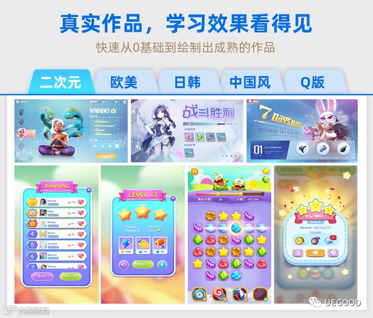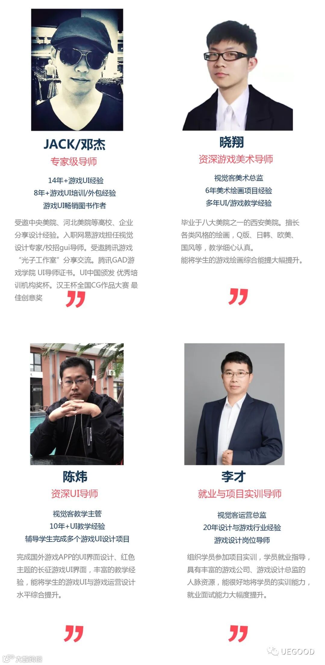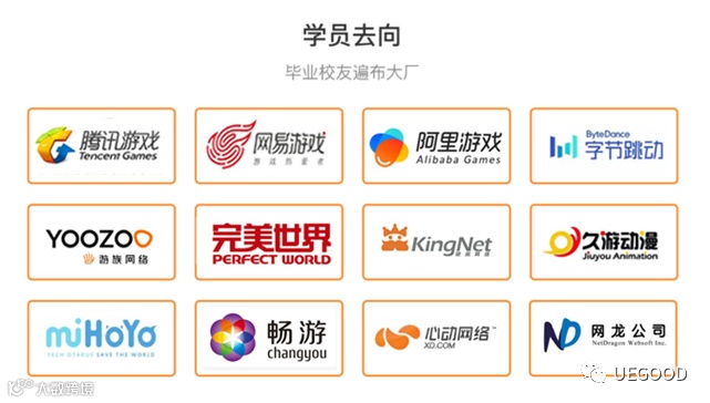 UEGOOD学院已培养数千名一线互联网公司专业人才,大部分就职于一线互联网公司,包括腾讯游戏、网易、阿里游戏、字节跳动、游族网络、完美世界、米哈游、墨白信息、凯英网络、巨人网络、心动网络、汇秦软件、畅游、盛大游戏、久游网络、网龙、泊彦传媒等知名企业,普遍薪资在8000-16000元/月,在职教育培训行业具有良好 口碑,在线上教学方面,作为腾讯课堂重点扶持机构,已培养2万多 名学员,帮助他们提升各项专业技能。