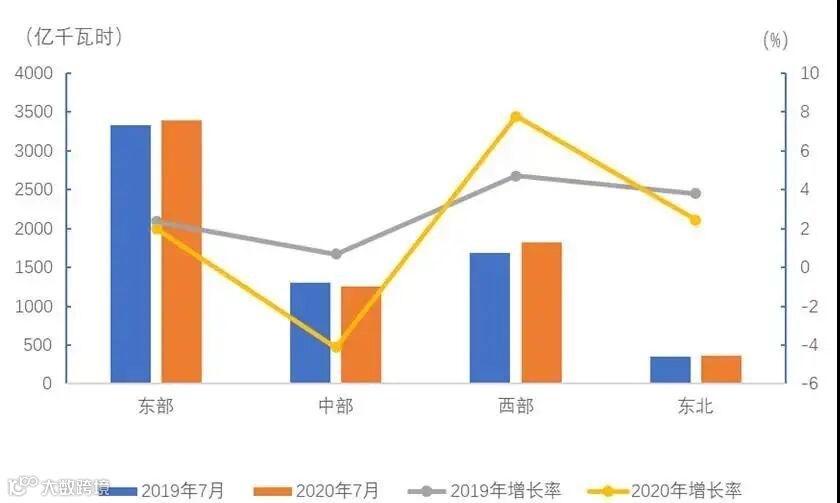 7月份,东、中、西部和东北地区全社会用电量增速分别为2.0%、-4.1%、7.8%和2.4%,其中,东、中部地区全社会用电量增速比上月回落4.4和9.6个百分点,西部和东北地区②全社会用电量增速比上月提高0.8和2.0个百分点。