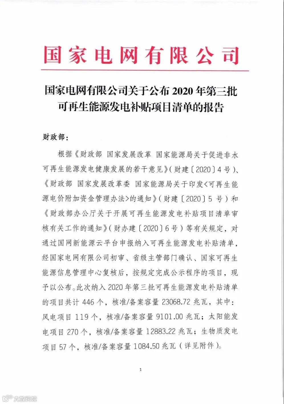 关于公布2020年第三批可再生能源发电补贴项目清单的公告