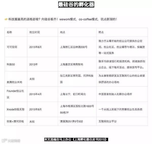 对于缺乏资金的创业团队来说,孵化器是最好的办公场所选择。今年8月,短租平台“马上办公”发布了《上海孵化器白皮书2015》,对沪上孵化器做了一个较为全面的梳理,发现上海的孵化器在地理分布、产业分布、价格、背景上呈现了一些独特的倾向: