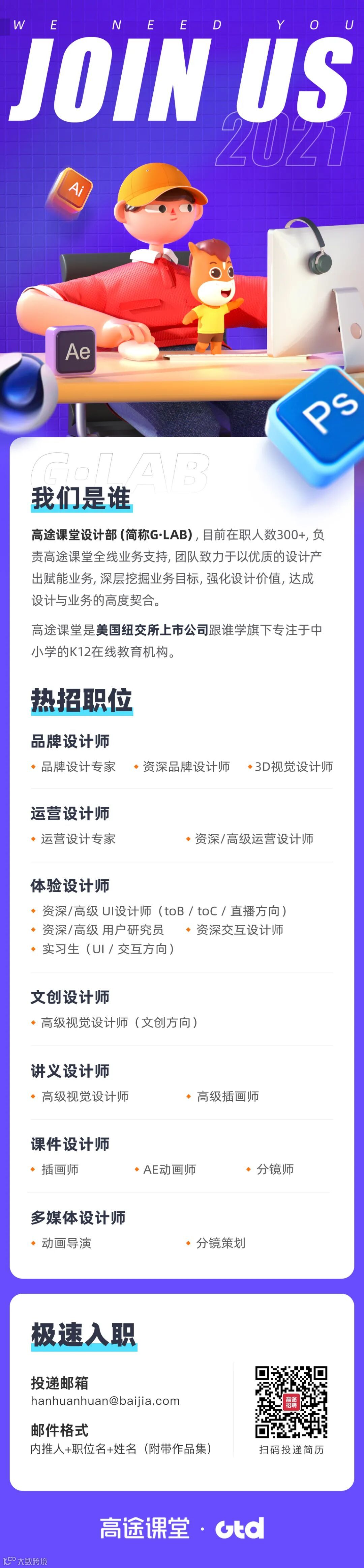 6.具备一定的项目管理能力、自驱力和抗压力,不断追求设计价值实现