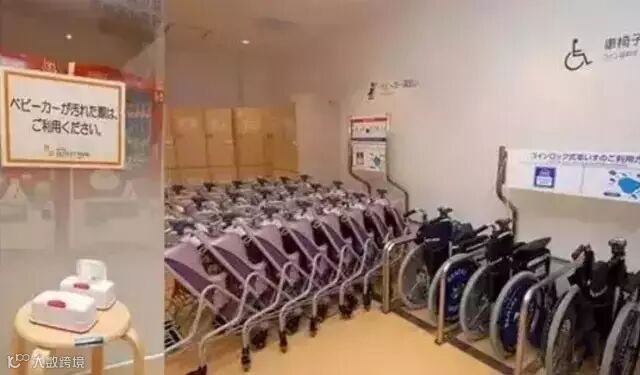 在商场入口附近有为带孩子的顾客准备的婴儿车和轮椅,下车即可利用,旁边放着消毒纸巾,用于擦拭婴儿车,商场的休息区内还会专门劈出儿童区。