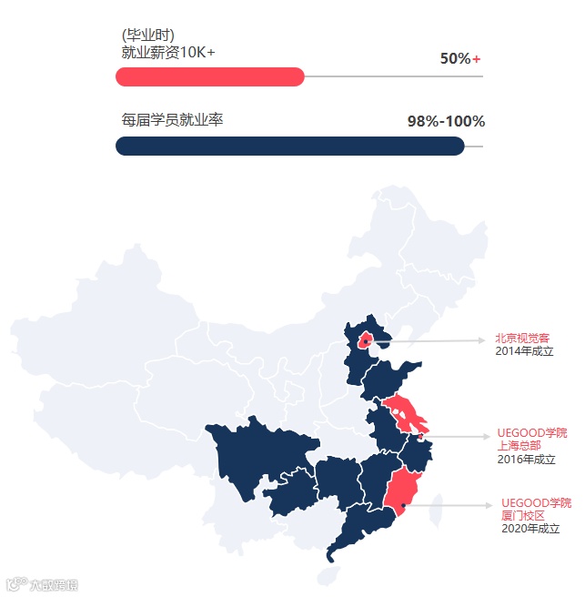 UEGOOD学院已培养数千名一线互联网公司专业人才,大部分就职于一线互联网公司,包括腾讯、阿里、华为、百度、爱奇艺、今日头条、收钱吧、智联招聘、千图网、吉利集团等知名企业,普遍薪资在8000-16000元/月。