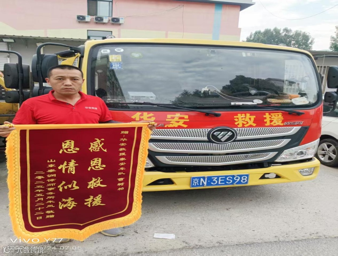 2025年5月20日,鑫华安救援泰安分队接到山东省泰安市泰山区泰豪新城紧急求援。救援技师曹树柏立即赶赴现场,为特斯拉Model 3新能源车实施专业救援。5月24日,车主朱凤女士特赠"感恩救援 恩情似海"锦旗,彰显救援服务的高效与专业。