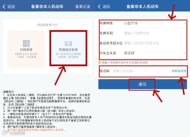 输入需要备案的非本人机动车的号牌种类、号牌号码、发动机号后六位等信息后,选择与车主关系,点击“获取验证码”系统将发送短信验证码至车主手机号码(车主可以是非互联网平台注册用户),申请用户输入车主收到的短信验证码。短信验证码验证通过后,提交备案申请即可。