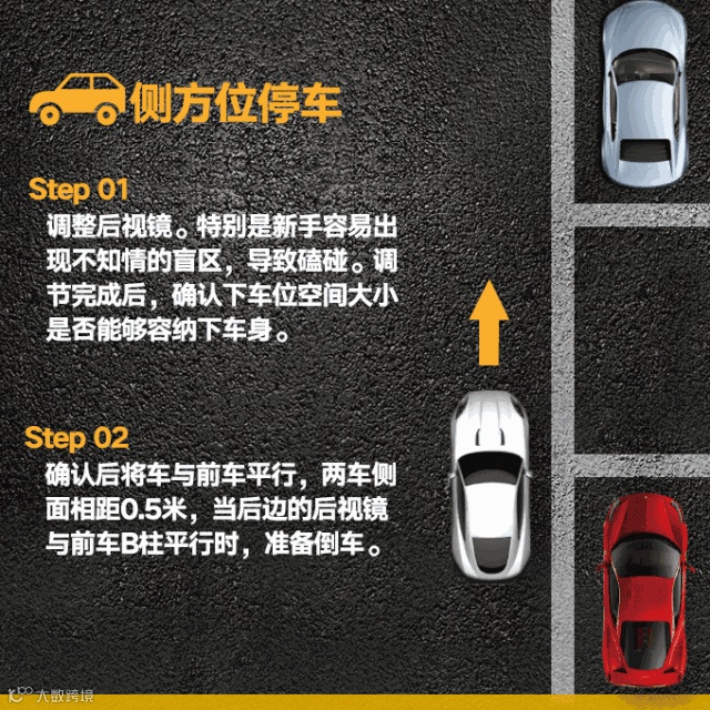 重点:车身的轴线和停车位的平行线夹角成45°。注意:谨记步骤和关键点,多加练习!