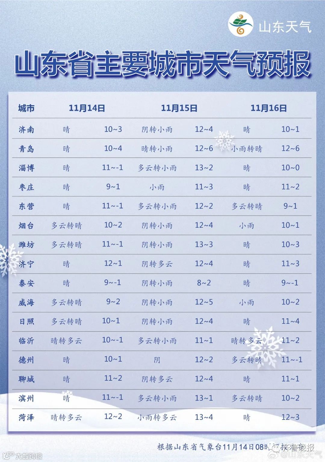 15日最高气温:济南、淄博和潍坊14℃左右,其他地区12℃左右。