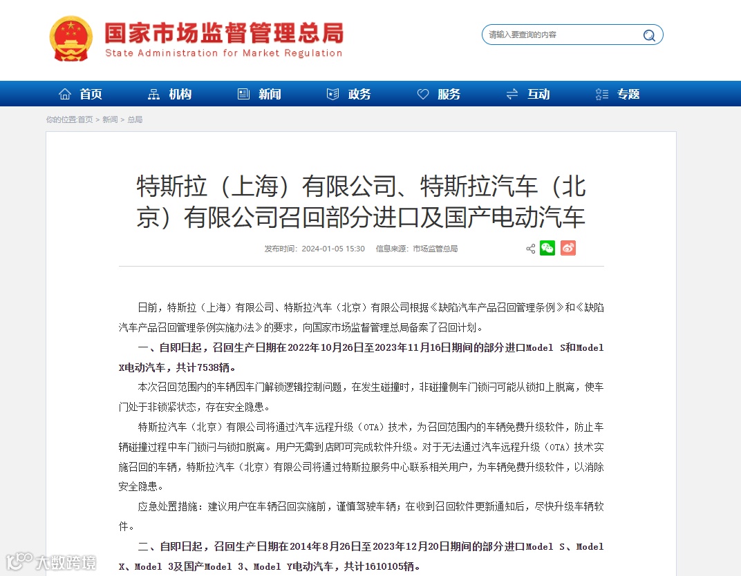 日前,特斯拉(上海)有限公司、特斯拉汽车(北京)有限公司根据《缺陷汽车产品召回管理条例》和《缺陷汽车产品召回管理条例实施办法》的要求,向国家市场监督管理总局备案了召回计划。