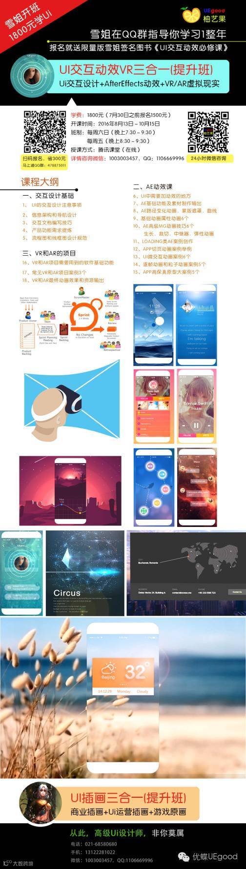 同是1500元的Ui交互动效VR三合一班,内含Ui交互设计,AfterEffects动效,VR/AR虚拟现实中的Ui设计,知识满满。