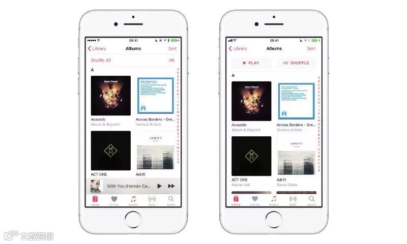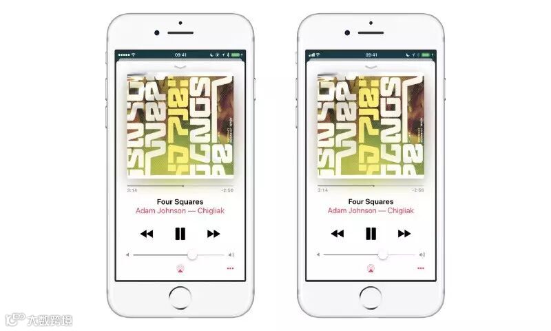 横向的 Tab bar 排列方式有改变(上新下旧),争取更多垂直空间。这个设计在 iOS 10 的 iPad 版本「音乐」App 就有了,只是应用到了 iPhone 上。
