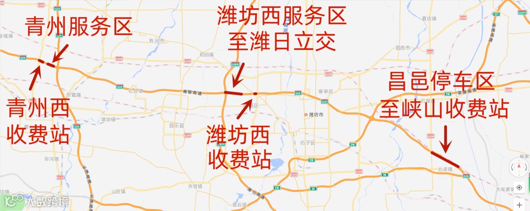 【潍坊段】潍坊西收费站附近、潍坊西服务区至潍日立交、昌邑停车区至峡山收费站。