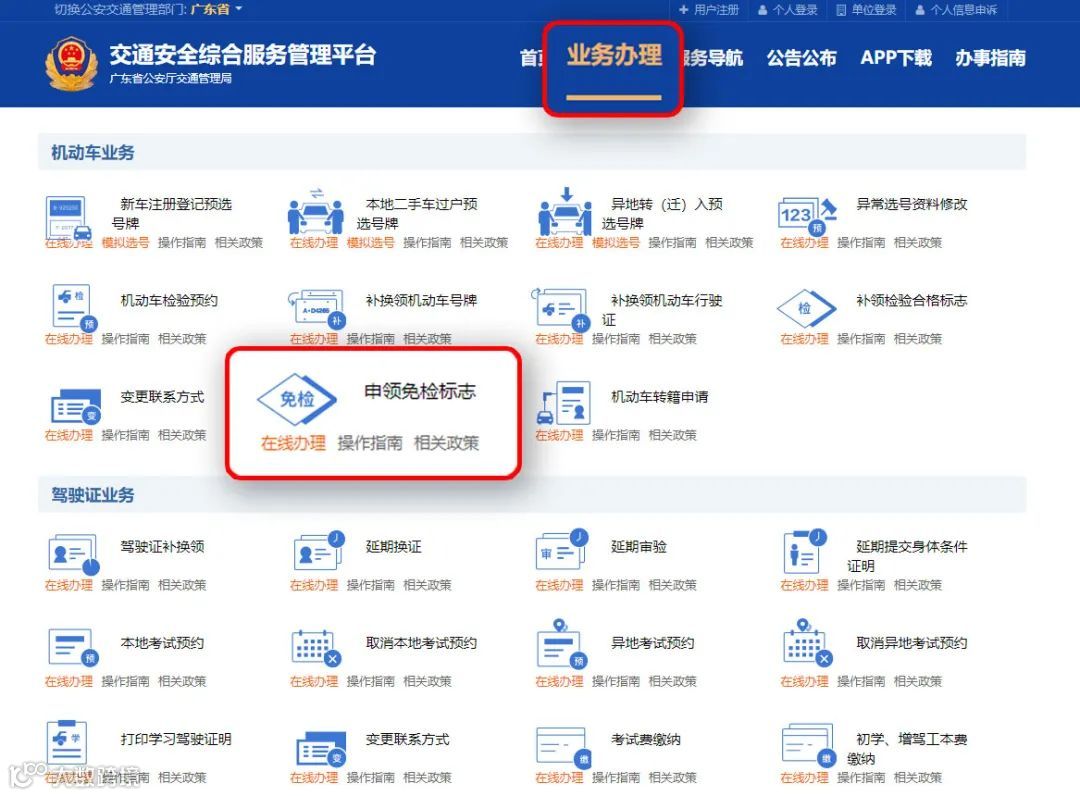 登录交通安全综合服务管理平台 → 绑定机动车 → 首页 → 业务办理 → 机动车业务 → 免检车申领检验标志(填写材料在线办理)。