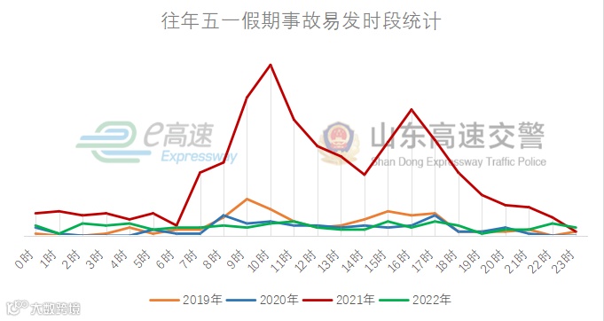 根据往年五一小长假期山东省高速公路事故量趋势统计,假期第一天及最后一天集中出行时易发轻微交通事故。
