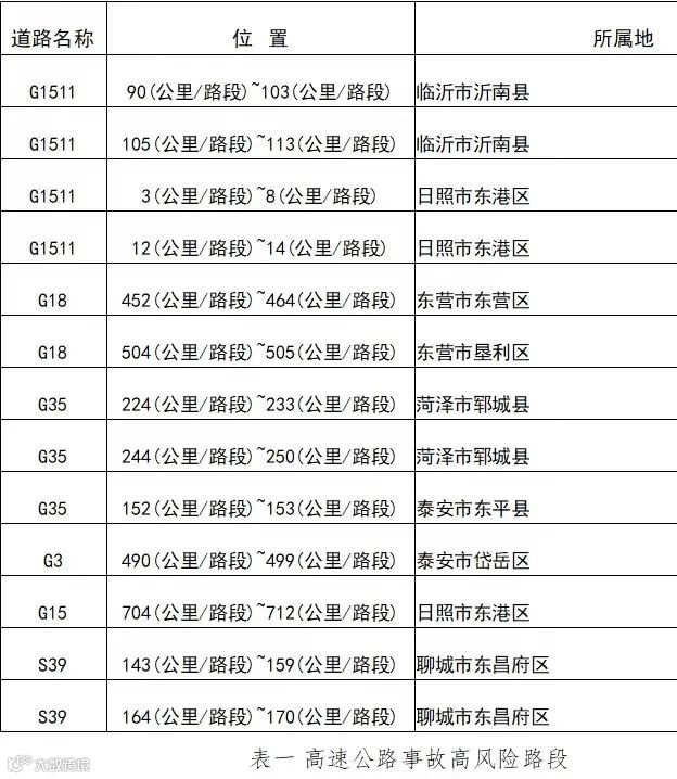 从近5年高速公路交通事故分布情况看,交通事故数量较多的高风险路段主要集中在G1511日兰高速、G18荣乌高速等路段(详见表一)。