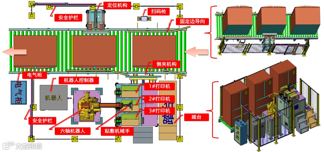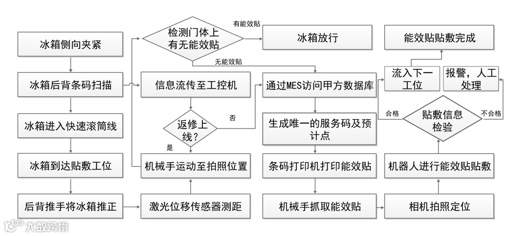 以冰箱的能效贴贴敷案例为例,总体设计方案配置扫码机构、定位机构、机器人搭配贴敷机械手组成的贴敷机构、打印机构。