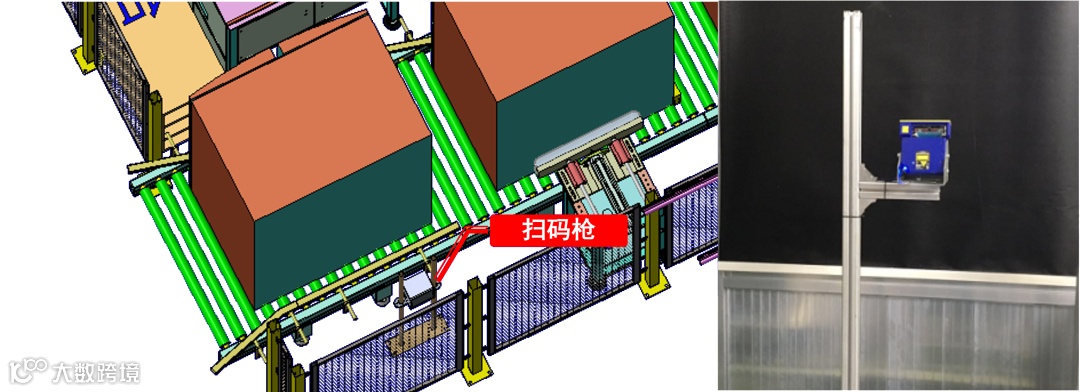 在冰箱快速进入段,产线一侧设置侧夹机构,确保冰箱进入工作位时后齐平姿态一致,为扫描枪识别提供位置基础;