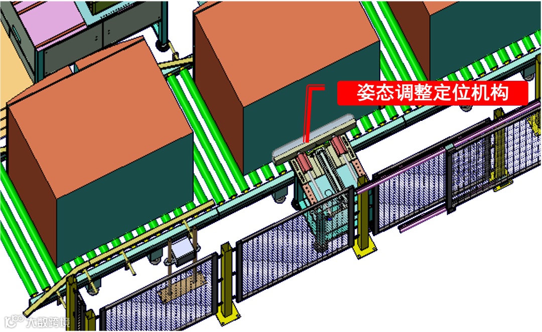 在冰箱贴装工作段,产线另一侧设置姿态调整定位机构,直接对冰箱进行姿态调节,保证目标冰箱每次停止位置准确,从而提高贴敷的精度。