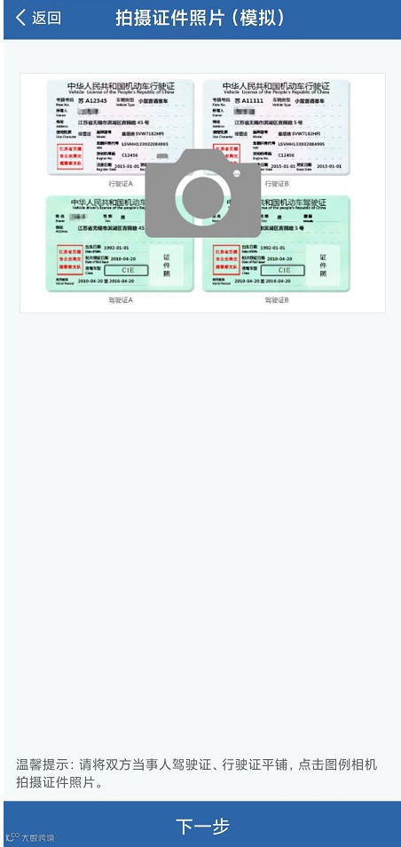 双方当事人撤离现场后,根据APP引导,需要拍摄双方证件照片和录入事故信息。即上传拍摄证件照片→ 录入事故信息。