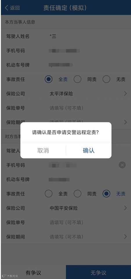 如果双方协商有争议的,选择有争议申请公安机关交通管理部门在线定责。系统将显示:责任确定→等待在线认定;签名接收→生成事故认定书。