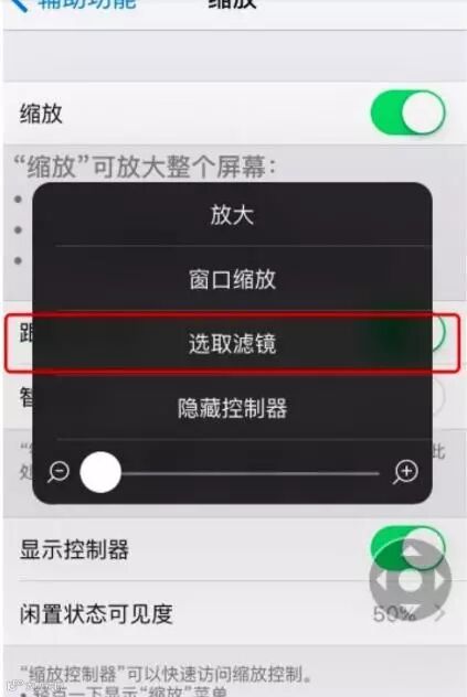 进入设置通用的“辅助功能”,打开“缩放”和“显示控制器”,点击出现的小浮标(控制器),在“选择滤镜”里面选择“弱光”,再点击“全屏幕缩放”和“隐藏控制器”,然后三指双击屏幕,整个屏幕就会变成灰色的色调。